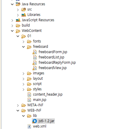 web-inf 폴더의 lib 안에 jstl-1.2 jar 파일을 넣어준다.